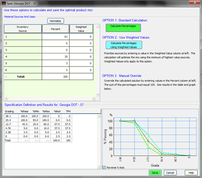 - Override the calculated solution by entering values in the percent column. The sum of the percentages entered must equal 100%. As adjustments are made the results are displayed in the table and graph.