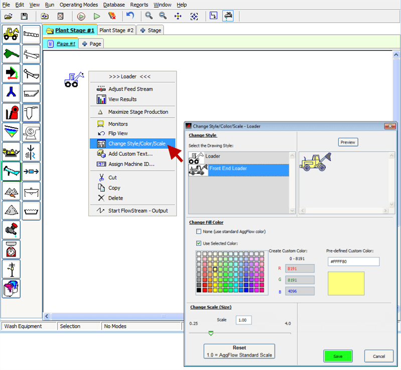 Customize the equipment drawings on the worksheet by changing the Style (type of drawing), Color and Scale. This can be done with every machine in AggFlow DM.