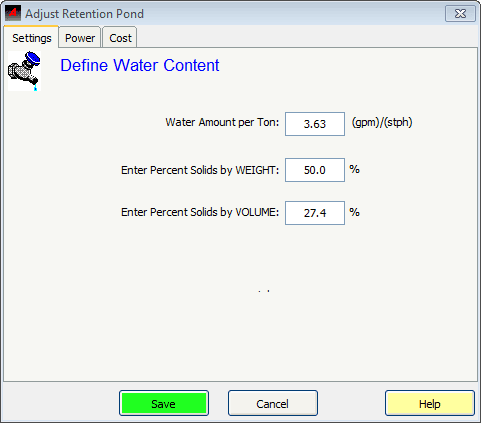 Retention Pondon the worksheet. 2. Clean water from the retention pond can be resent to the operating plant. 3. Right-click and selectAdjust Setup. 4. Define: -Water Content-% Solids by Weight-% Solids by Volume5. AggFlow will use these entries to calculate water and material wash balances throughout the plant.