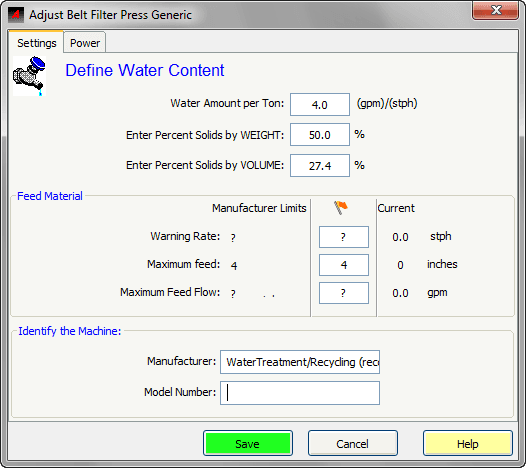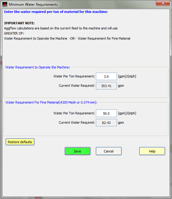 Clicking on this opens a window to determine the water required per ton based on the feed rate to the machine. If the water exceeds the manufacturer minimum for the machine, the minimum water required on the Adjust window will be set to the value calculated by this feature.