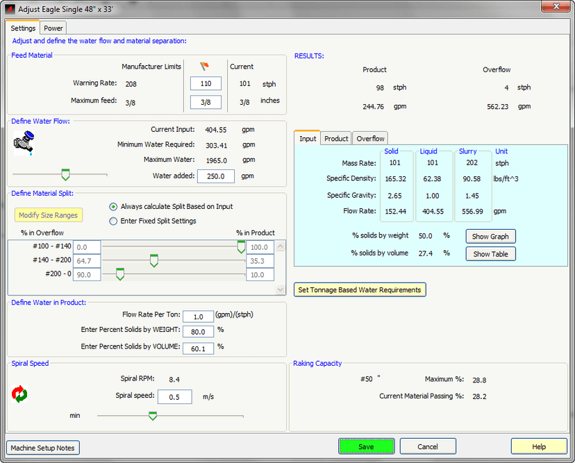 - Overflow: Adjust the Split Point as desired and review solid, liquid and slurry rates in the overflow stream. The split point is controlled by the amount of water coming into the tank, the amount of water added to the classifying tank, and the amount of water recirculated. As you modify the amount of water added and recirculated, the overflow results are automatically updated. Use the Recalculate button to see the effect of changing the water amounts on products A and B.
